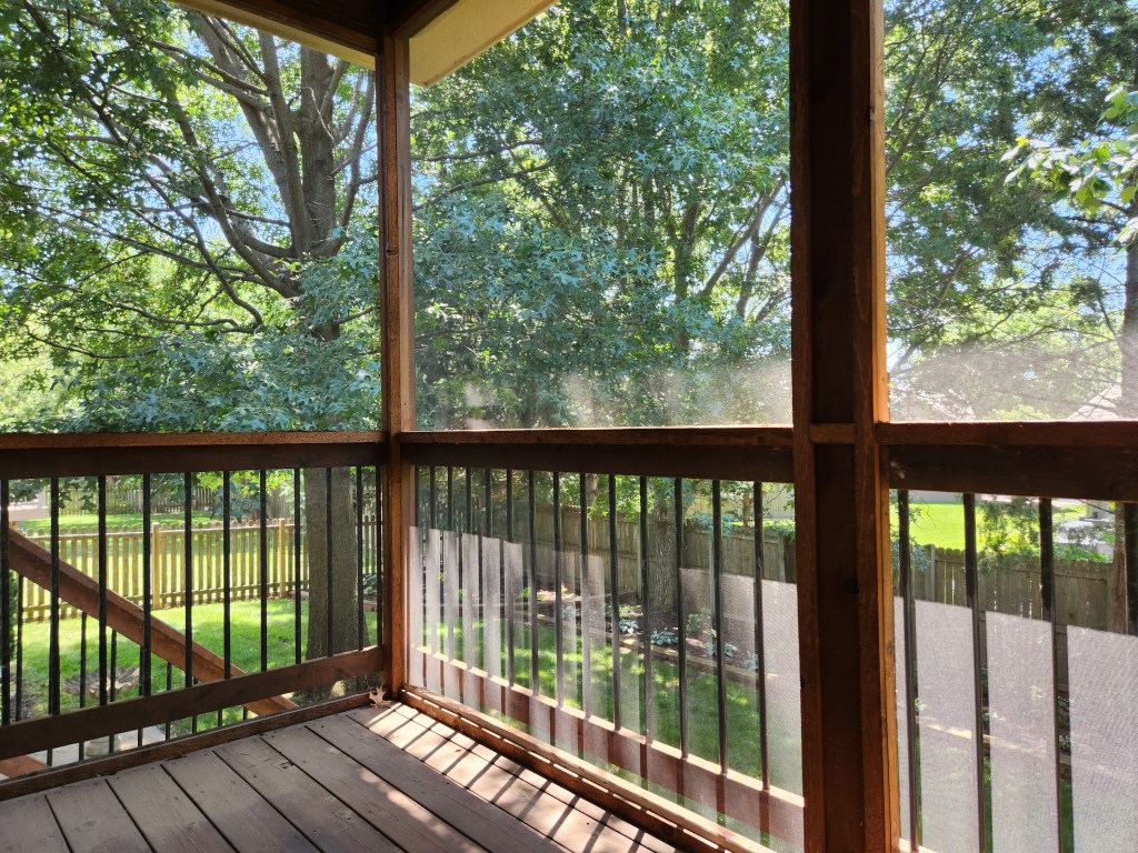 One thing my husband and I have been dreaming about since staying at my parents’ house for the last 4 weeks is having a screened-in deck. We know it will be expensive and probably won’t be able to happen for a while due to medical expenses, but it is something that we have really enjoyed over the last 4 weeks and are interested in adding into our lives at some point. (The image below is where I have been sitting in the figurative mud this week at my parents’ house, and it has been such a gift.)