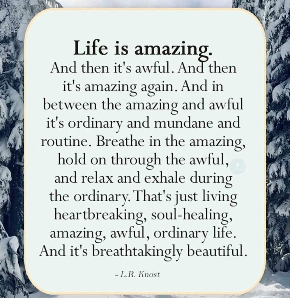 While I agree with the image above, I think it is even more accurate to say that life is simultaneously amazing, awful, ordinary, and mundane. Life is both brutal and breathtakingly beautiful at the same time. Even though I am in the messy middle of the most difficult time of my life to date, I am so very grateful to still be here.