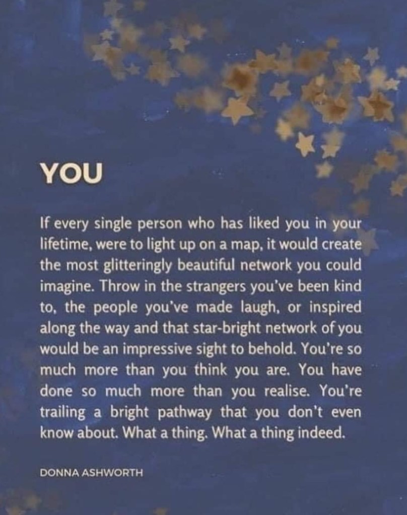 I hope this sentiment is true. I hope that I have been kind to people, made people laugh at times, and inspired people along the way. I will continue to do my best to honestly and authentically share the messy middle in the hopes that I am helping others in some way. Maybe our therapist is right. Maybe I am creating a glitteringly beautiful network and trailing a bright pathway that I don’t even know about.