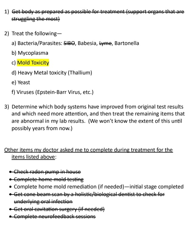 In addition, my most recent blood test results from April indicated that my immune system is working hard to fight bacteria. This makes it difficult to know if we should go back to Lyme (and Lyme Co-infections) now or continue on the mold toxicity path and return to Lyme at a later date. At this moment in time, we are thinking about still trying mold toxicity treatment and then going back to Lyme like we had planned. If we don’t try to work on the mold toxicity, then my body won’t be able to fight off the bacteria, and this cycle will continue.