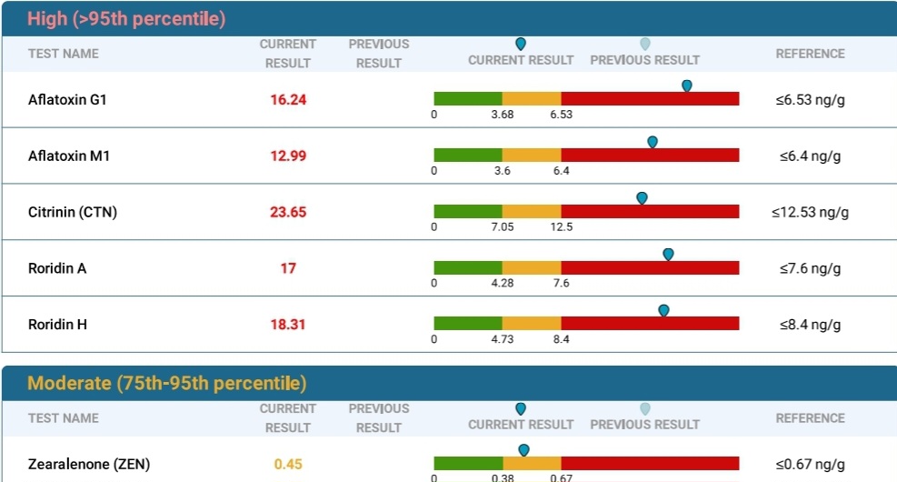 In order to provide some context, here are the results from a mold mycotoxin urine test I completed in February 2023: