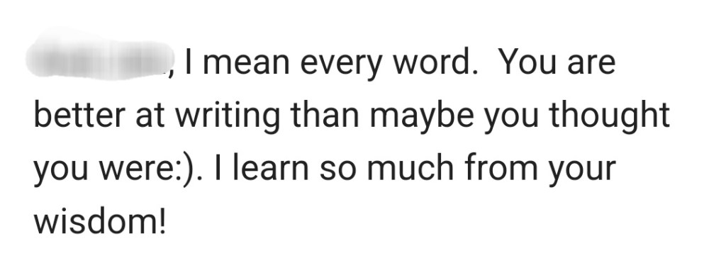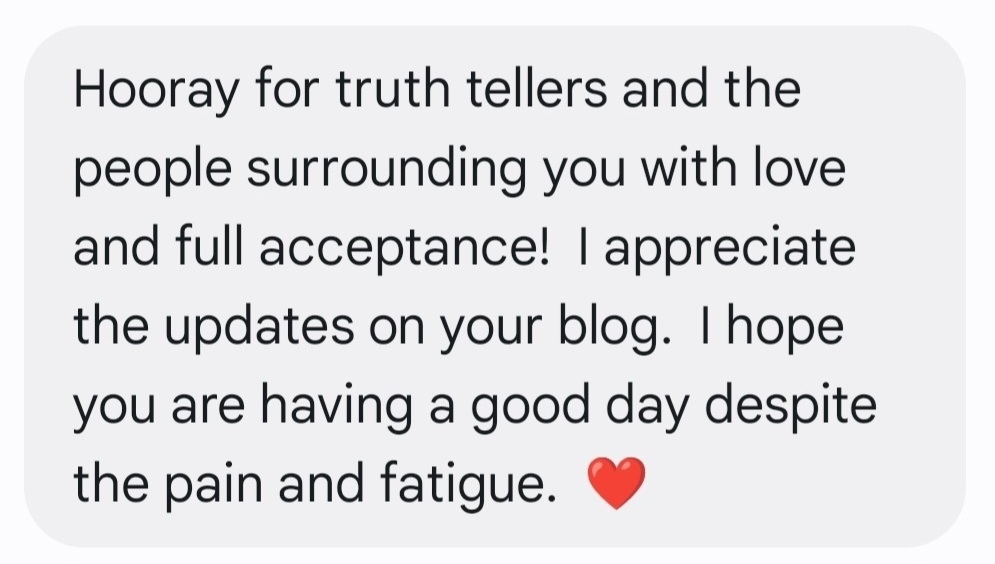 Then, our therapist told me at our therapy session the next day that she looks forward to reading my blog posts. She knows that I consider myself more of a math person than an English person, but she thinks that one of my strengths is putting words to the experiences of people who live alongside invisible, complex chronic illnesses. She frequently tells me that I have gained a lot of wisdom over the years from my experiences. And, just as her clients learn from her, she learns from us as well. She also stated, for the second time, that my writing reminds her of a famous author and social scientist we both greatly admire, and I thought I might die right then and there. 🤣 I emailed our therapist after our session to thank her for her support, and here was her reply: