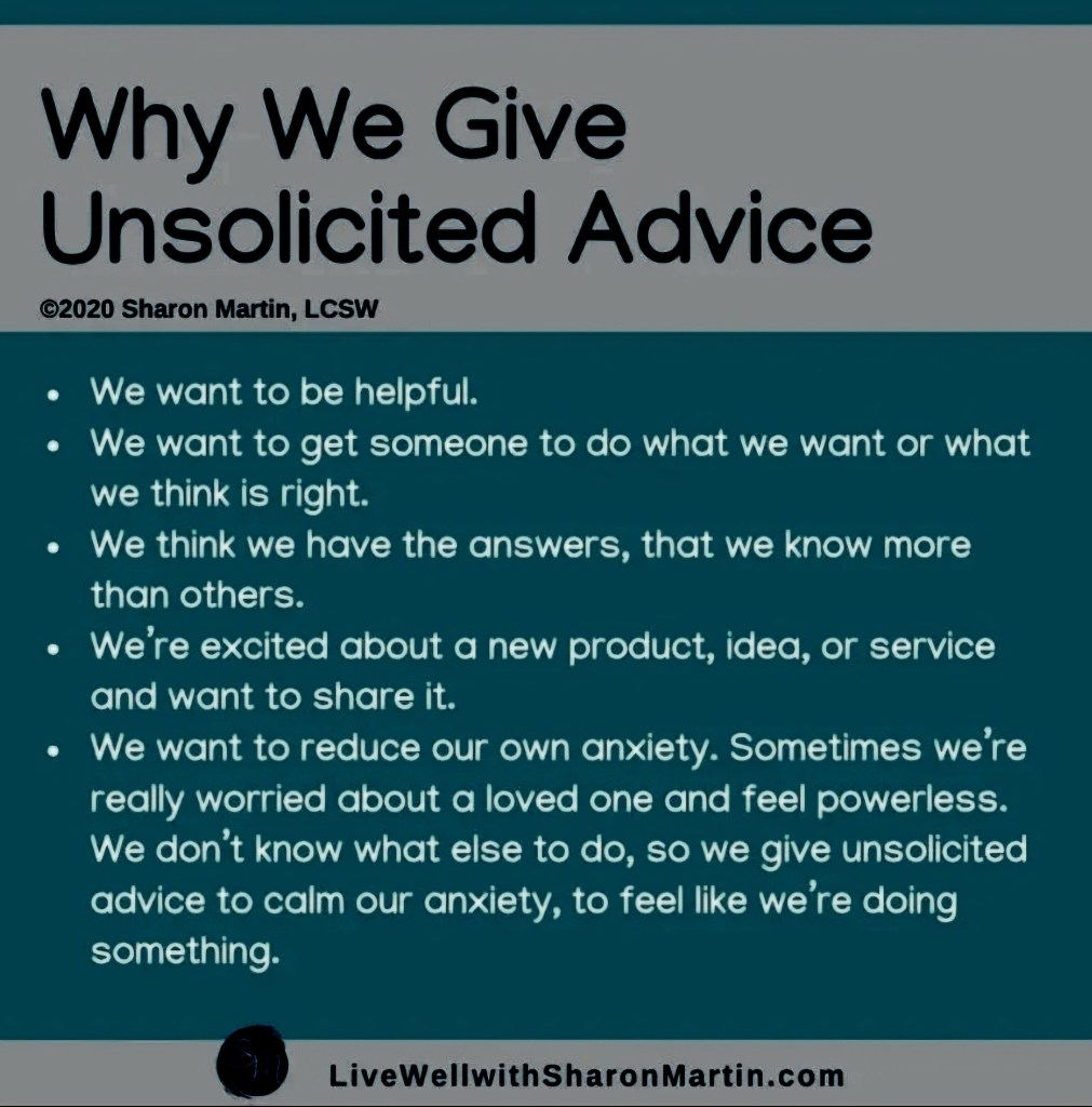 I am always trying to learn as much as I can about myself and the world around me, so I have been doing an exploration into unsolicited advice over the last few years. It is a topic that is fascinating to me since my husband and I are on the receiving end of quite a bit of unsolicited advice. I have put in the work to learn more about unsolicited advice and why it is so common. I have addressed the topic on numerous occasions (e.g., Am I Listening or Problem Solving?), but the more I share my health journey, the more this topic is highlighted. Recent situations involving my husband and I receiving unsolicited advice have reminded me of what I have learned over the last few years.