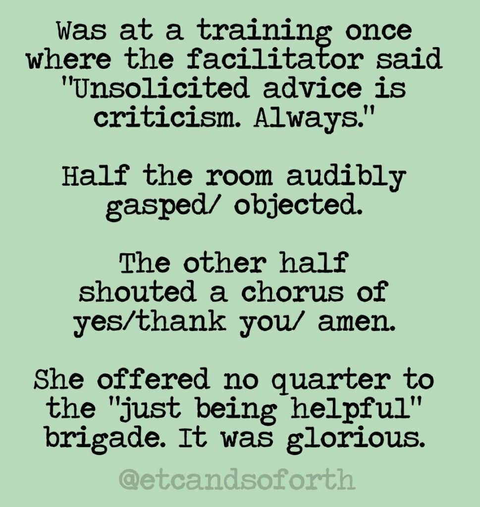 The last reason seems to be accurate for a lot of people based on what I have learned from my own experiences with unsolicited advice, from others’ experiences, and also from licensed, trained professionals. It is uncomfortable for us to watch the people we love in pain and/or distress, so in order to regulate our own nervous systems and get back to being more comfortable, we give unsolicited advice. We feel better — are soothing ourselves — by giving the other person our advice. It is not about the other person at all. It is about our own need to regulate our nervous systems and be less uncomfortable.