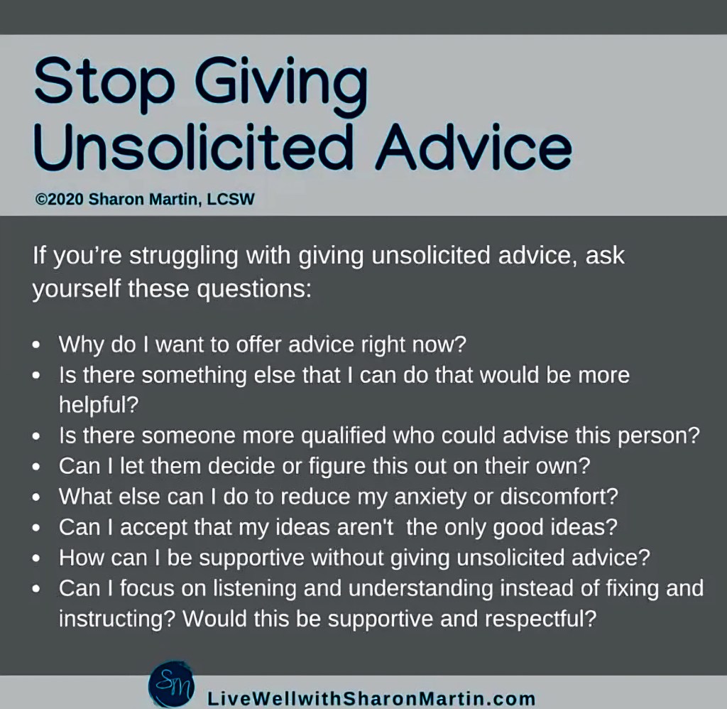When I notice the urge to give unsolicited advice, I ask myself some of the following questions: