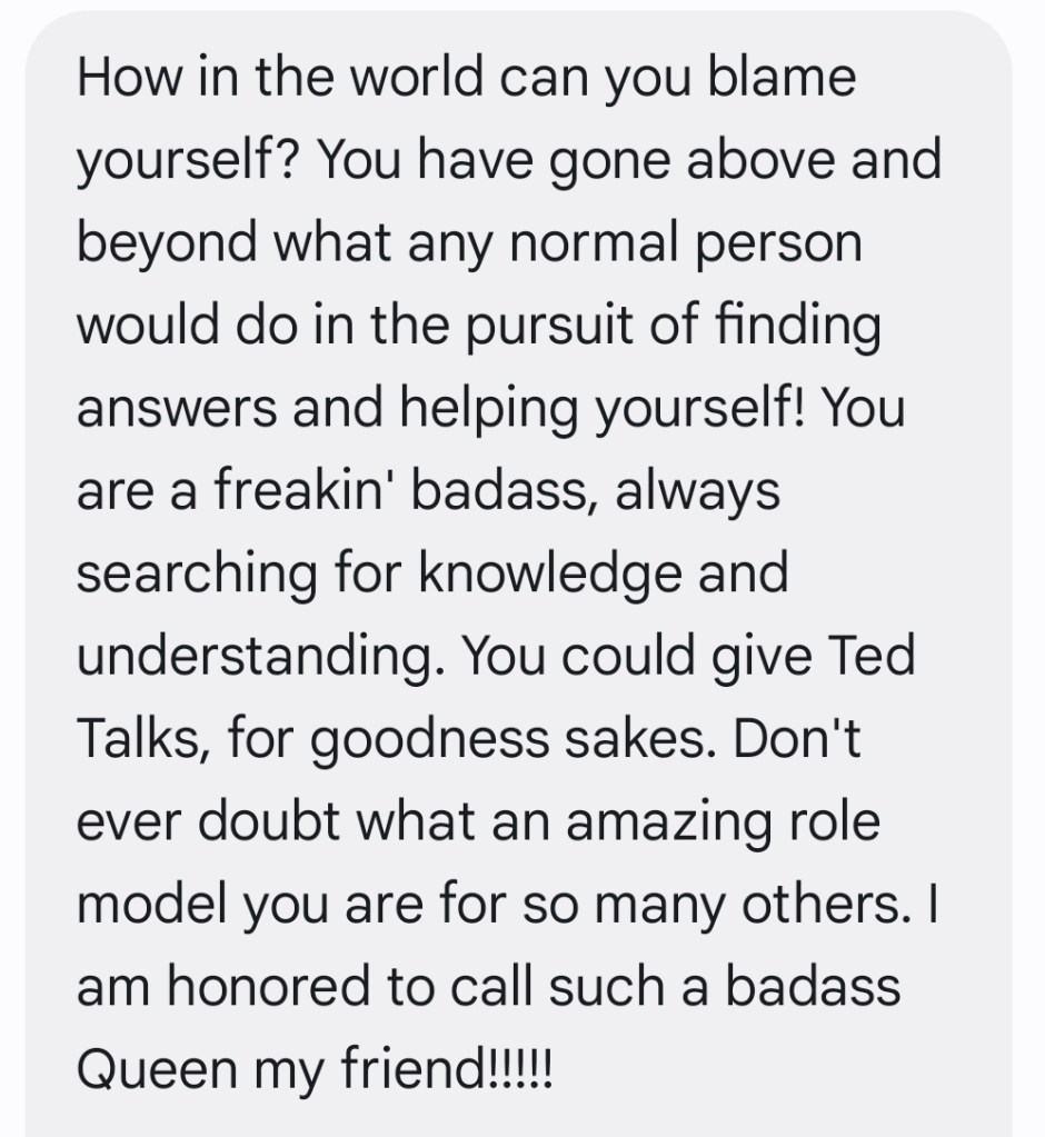 Last week, when I was at both my physical and emotional limit, I told my friend that I was having a bad day and working on not blaming myself. In my logical mind, I know that none of this is my fault, but it can be hard to remember in the most difficult of times. Here was her message of support back to me: