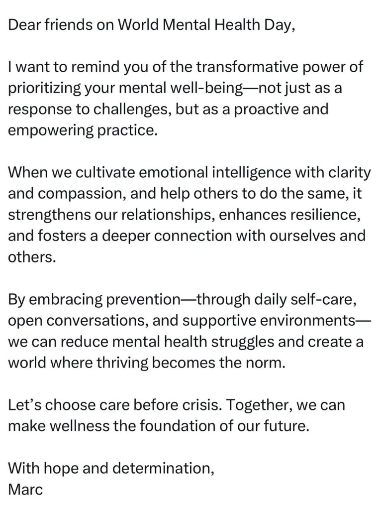 I recently watched a podcast episode with Marc Brackett as the guest. Marc is the Director of the Yale Center for Emotional Intelligence and a professor at the Child Study Center. It was a great interview about the importance of emotional intelligence and choosing care before crisis. Here is what he posted on Instagram last Friday for World Mental Health Day: