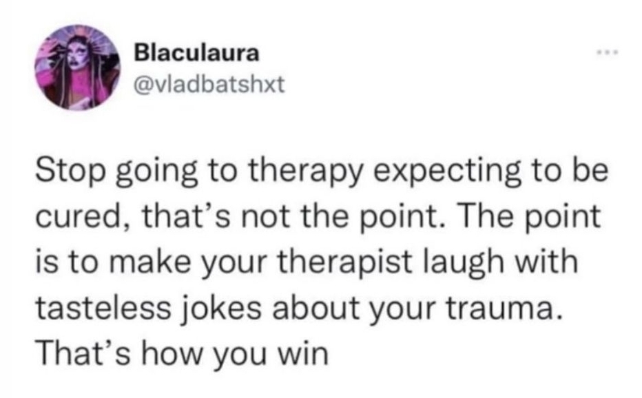 I have sought out mental health support from a couple of different therapists at various points throughout my adult life, and the specific therapist matters. There are terrible therapists out there, and I have never been afraid to make a change if their training and/or skill set doesn’t match my needs. I am fortunate that our current therapist is the best of the best. She knows her shit, cares deeply, and is able to hold space for any and all feelings. Since we have a healthy (and fun) therapeutic relationship, I saw this image a few weeks ago and sent it to her in case she needed a good laugh: