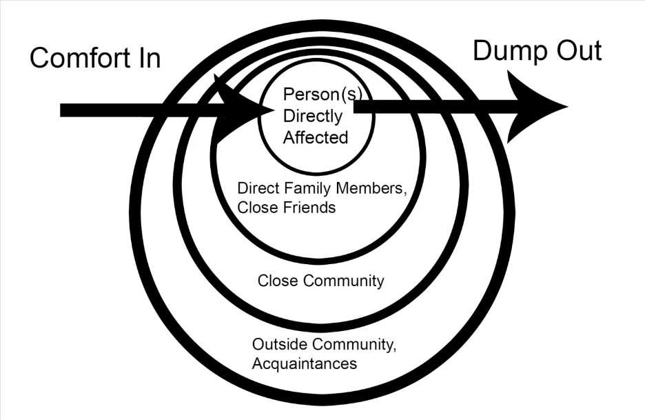 The rest of the “Dump In, Comfort Out” concept goes like this: The person/people in the original circle can dump out to anyone in their lives (in terms of venting about the life event). And, the people in outer circles can only dump (vent) out about this life event to bigger circles versus dumping in to smaller circles. Each circle can vent about the life event to a circle of people who are further away from the life event, but they shouldn’t vent to people who are closer to the life event. People in the outer circles should only provide comfort in. Otherwise, the people who are dealing with the difficult life event feel pressured to comfort the people who are less affected in the outer/bigger circles, and that is the opposite of support. Don’t be the person who adds more to the plates of the people who are directly impacted by the life event by asking them to comfort you about their own life event. One of the biggest mistakes someone can make while trying to support others is to dump (vent) in. Don’t vent about how much the life event is impacting you to the people who are more directly impacted. As long as you are not crossing any boundaries, you can vent all you want about the life event, but you need to make sure you are venting in the right direction. [Keep in mind, there is a difference between venting about how a situation is impacting you and talking about people behind their backs. Being a person of integrity is important.] Comfort is what needs to go inward towards the people who are impacted the most by the life event.