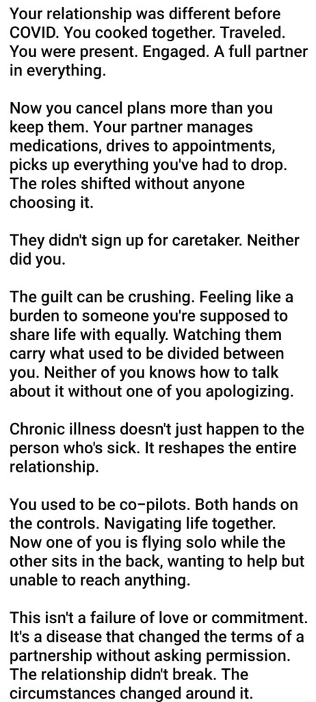 Regardless of the blueprint that is created by a couple, life events change it. As I have stated many times, chronic illness reshapes entire relationships. Here is how Dr. Robert Groysman describes relationship changes with long COVID, but his description can be applied to most chronic illnesses:
