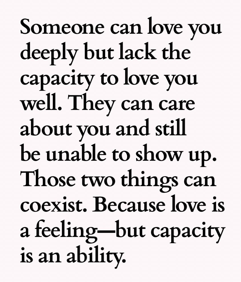 5) A person can love you but lack the capacity to love you well. There are some people in my life who love me but lack the emotional capacity to love me well during the difficult times. They have yet to develop the capacity to deal with their own emotions and feelings about what I am experiencing on this health journey, and it is impossible for them to show up for me when they haven’t yet shown up for themselves.