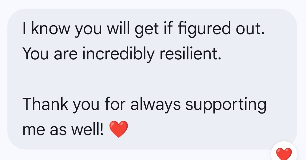 I have also been continuing to visit my secondary practitioners for assistance in dealing with some of the symptoms. I went to my chiropractor/acupuncturist early last week, and she helped ease some of the pain, dizziness, and nausea. The next day, she texted me to see how I was doing. I told her that I was definitely a little better than the day before, that I was grateful for her help, and that we were still trying to determine next steps. She replied with the following words of encouragement: