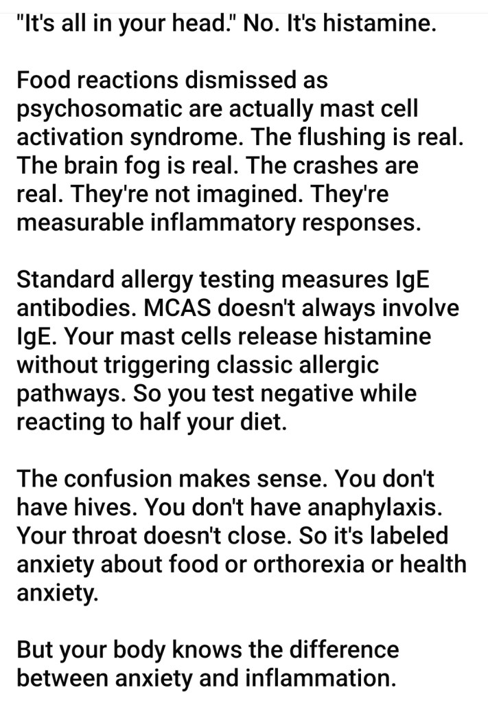 Last week, I wrote about 11 days of improvement and then a physical crash. We have gained more information over the last few years to help us better understand why the physical crashes happen. Based on what we know right now, the physical crashes seem to point back to MCAS and histamine (see my MCAS post from 2023). Robert Groysman, MD, describes MCAS and how it is often mistakenly labeled anxiety about food, orthorexia, or health anxiety: