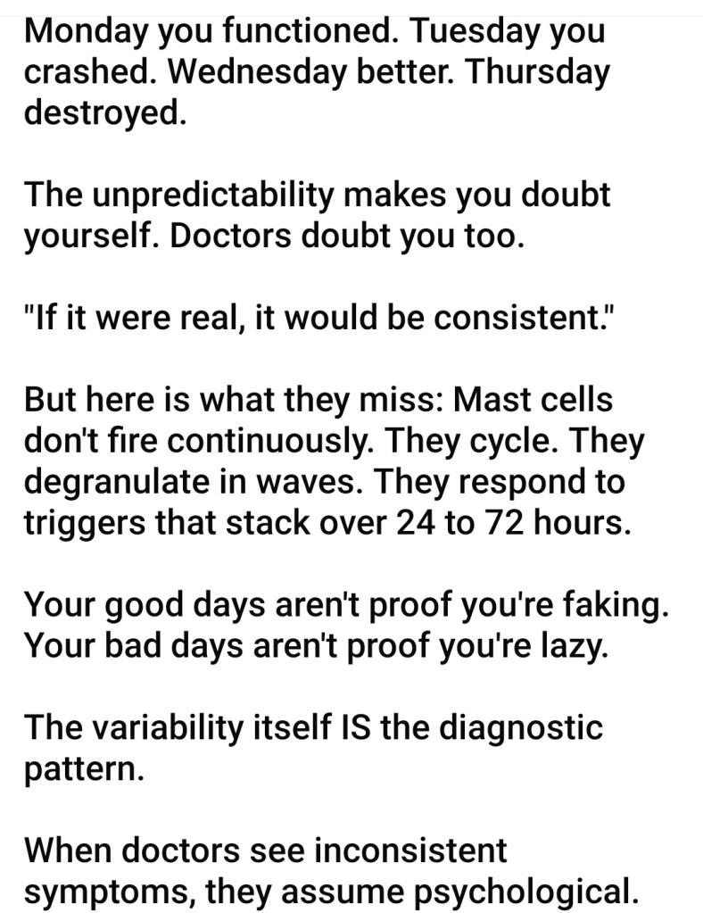 Because the symptoms of MCAS/histamine issues are inconsistent, medical professionals, as well as some family members and acquaintances, can mistakenly assume that the root cause of the symptoms is psychological instead of physical.