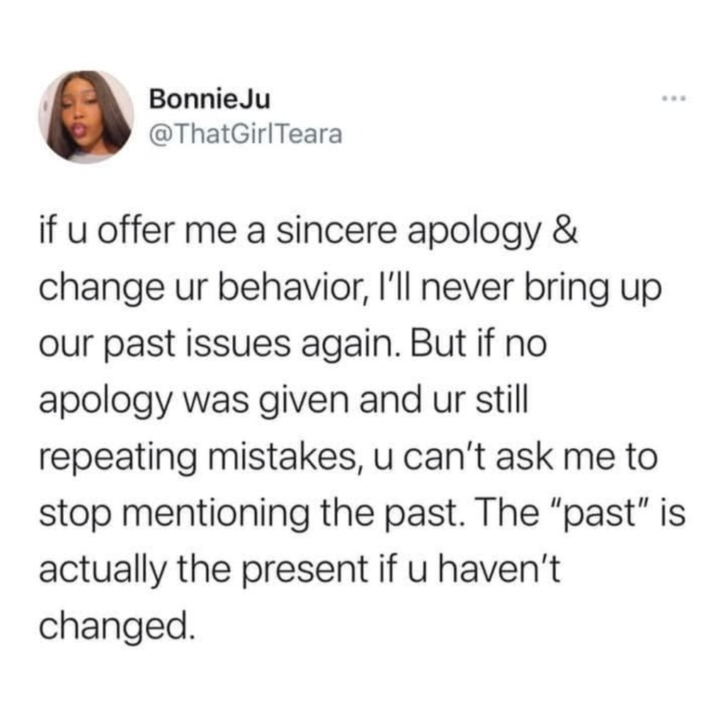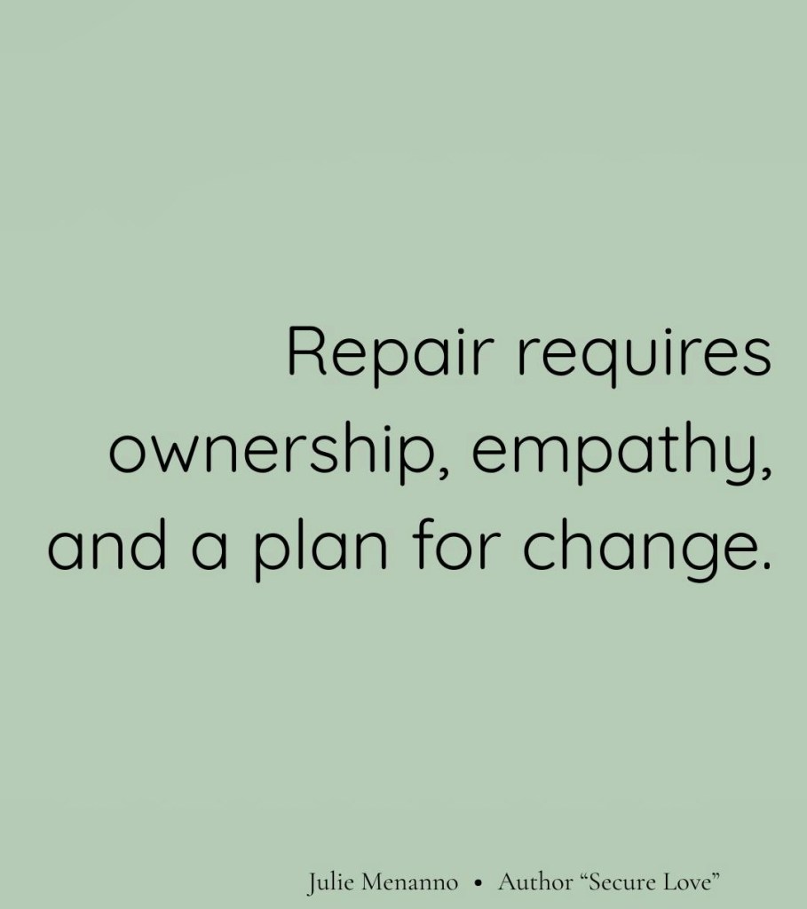 People used to apologize by just saying sorry and not discussing how to keep the situation from happening again. And, if there wasn’t a plan for change, then the same situation would probably happen again and again. Trust cannot be repaired in a relationship when there has been a rupture if there is no commitment to trying to prevent that rupture from happening again.